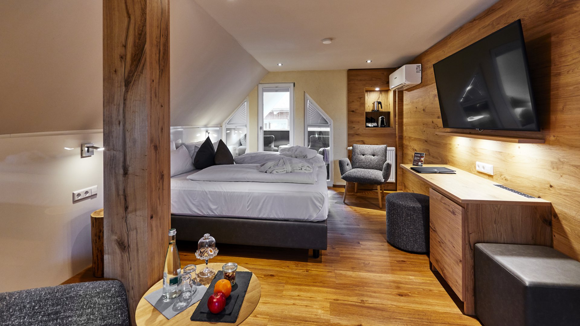 13 Jahre Umbauarbeiten. Entkernung. Energetik mit Blockheizkraftwerk. Anbindung an Nachbarhäuser. Drainierung der alten Stadtmauer, auf denen das Haus steht. Wir haben durchgehalten. Haben den Garten terrassiert, alte Steine und Balken freigelegt, wo es möglich war. Haben ein wunderschönes SPA gebaut und eine Gartenlounge, eine Bar und eine Kamin-Lounge. Alles unter Federführung von Carmen: Hotelchefin
