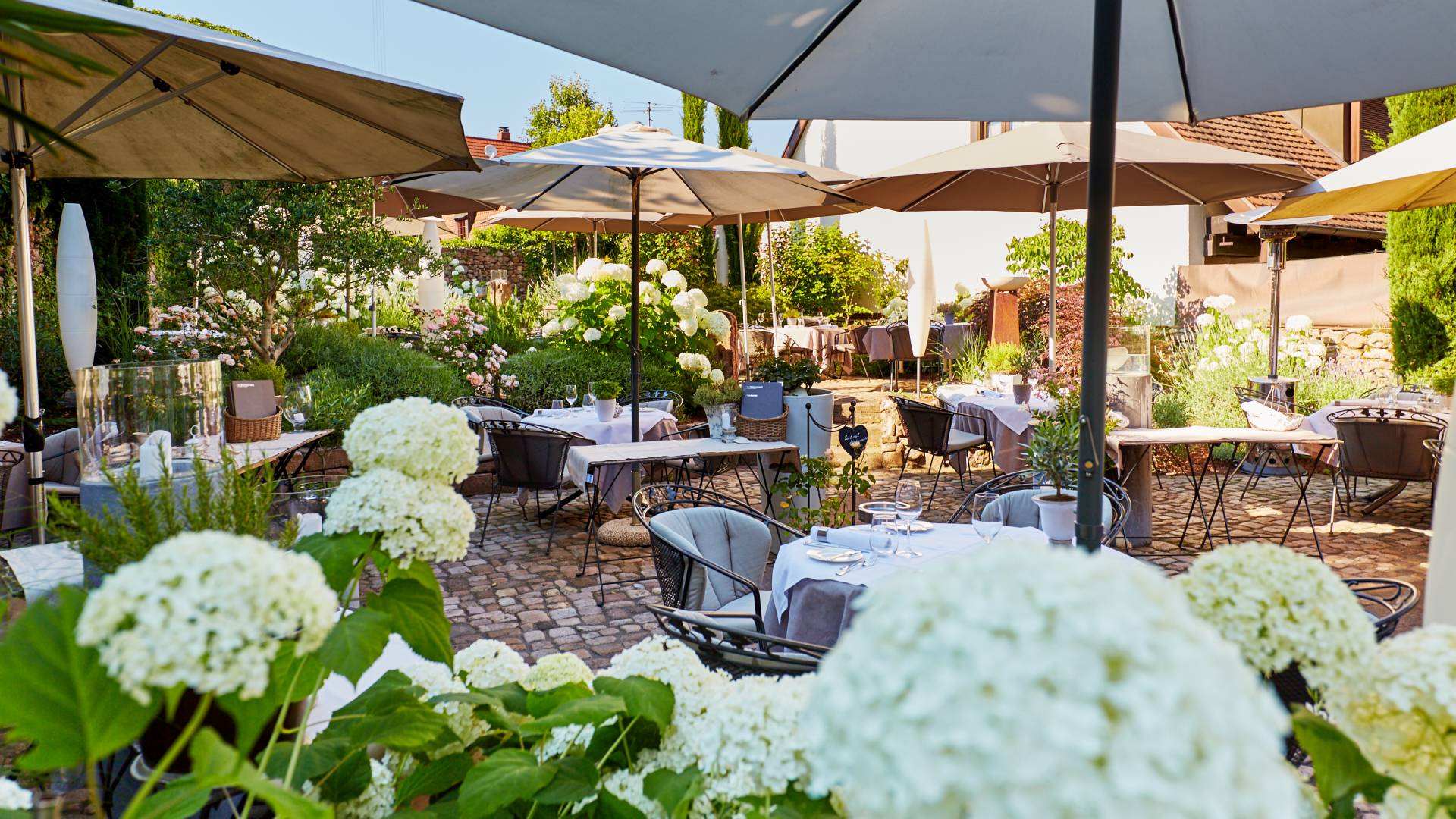 Es ist wahrlich traumhaft schön, das Garten-Restaurant der Reichsstadt, zwischen historischen Stadtmauern von Gengenbach. Ruhe und Vogelgesang. Erdiges Beige und warmes Weiß an den Tischen, die Farben des Sommers im Garten. Hortensien und Lavendel, Zypressen und Olivenbäumchen. Blühende Blickfänge der Natur. Und auf dem Teller: Blickfänge, die auf der Zunge zergehen. Genießen Sie die humm´lischen Kreationen Gang für Gang, bis der Genuss mit einer Dessertvariation unter dem Sternenhimmel ausklingt.